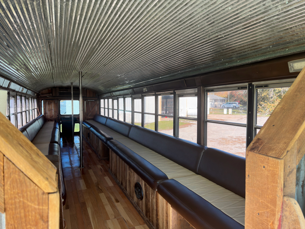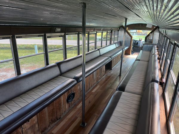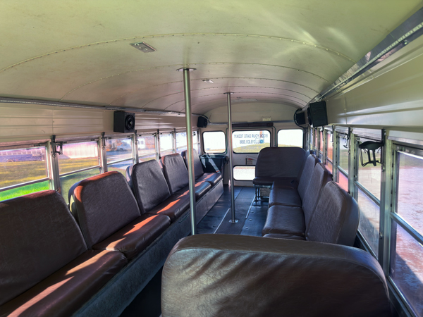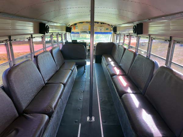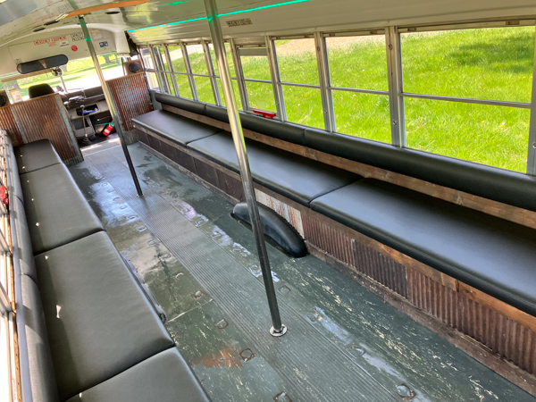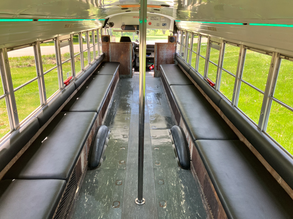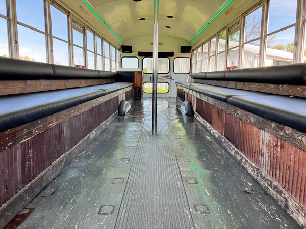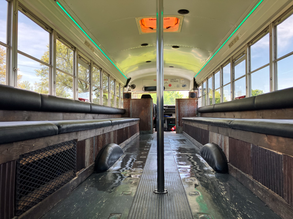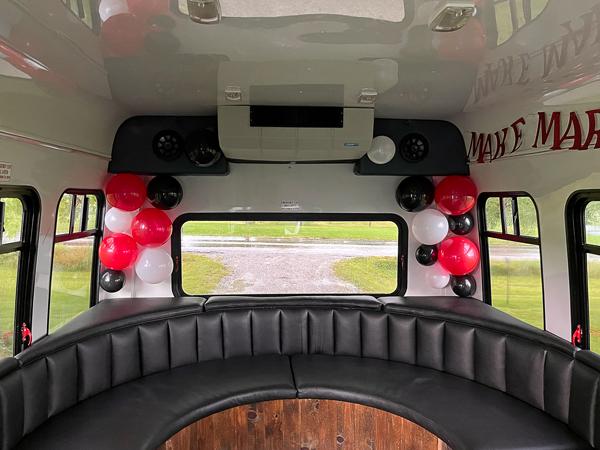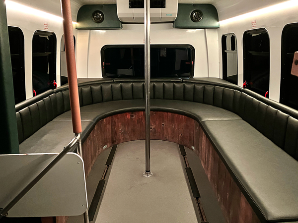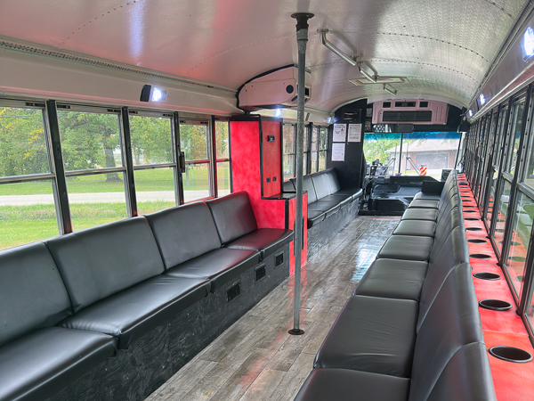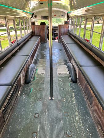 Heat, 4 surround speakers, 2-12″ subwoofers, bench seating along walls, cup holders, 1 dance pole, hand rails, wood trimming, LED multi color lighting, tinted windows, seating for 40, Bluetooth capable stereo system, USB charging ports.