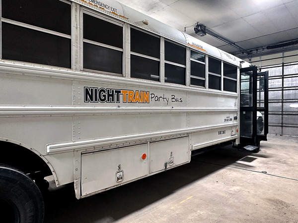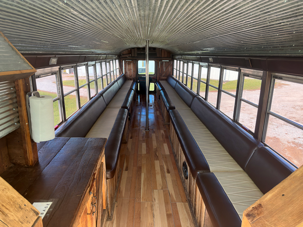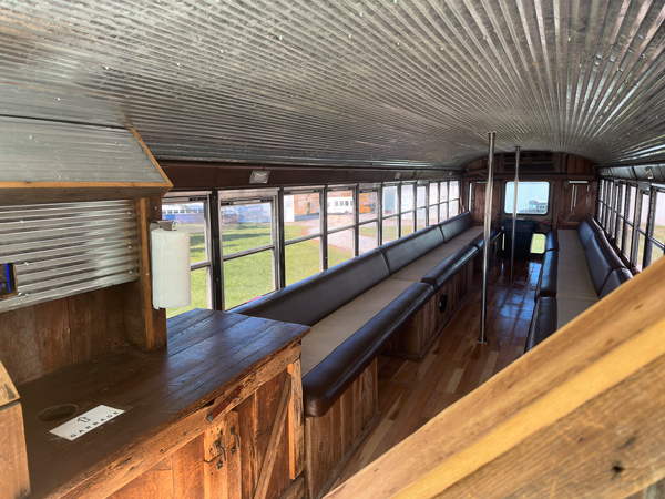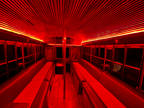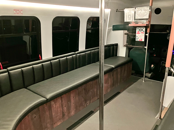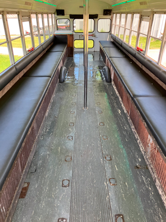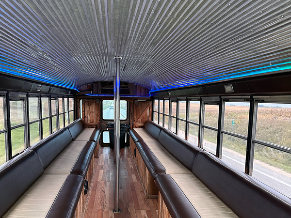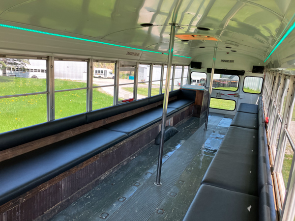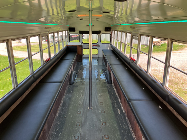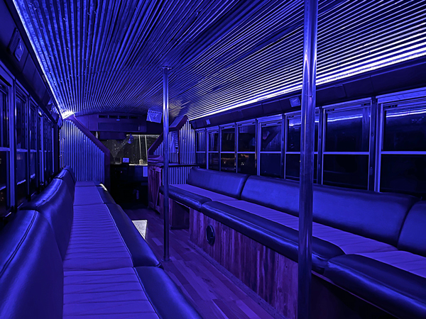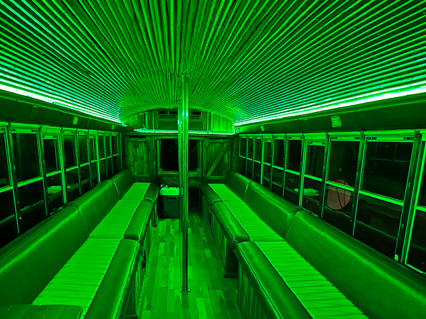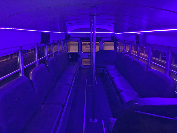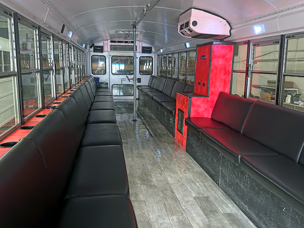 Ice cold A/C, heat, 4 surround speakers, 1-12″ subwoofer, bench seating along walls, wood trimming, LED multi color lighting, tinted windows, equipped with 2 dancing poles, seating for 40, Bluetooth capable stereo system.