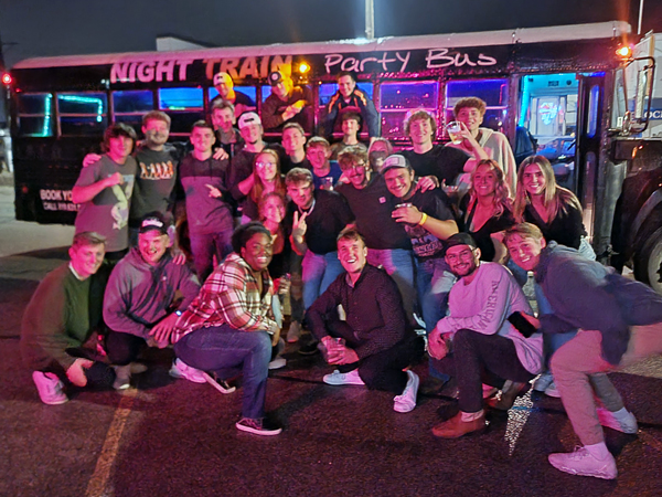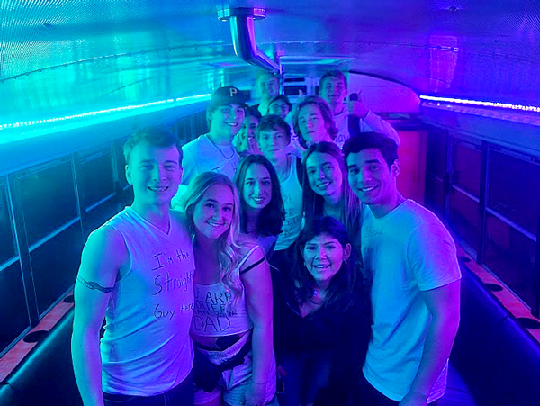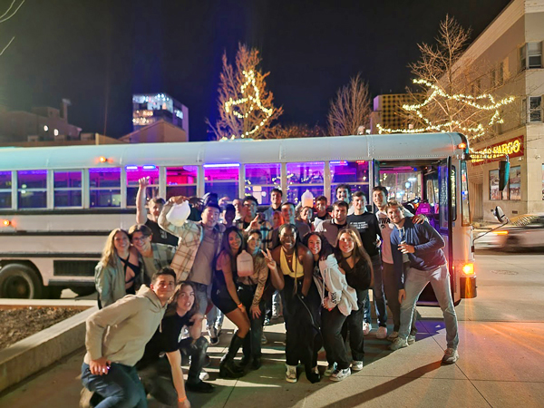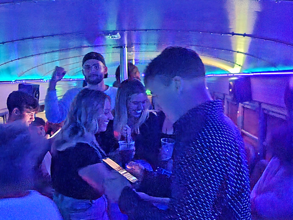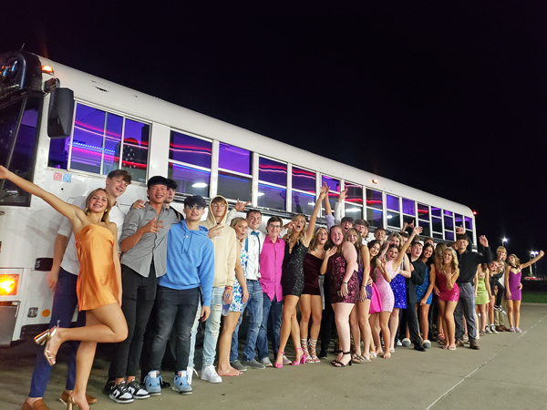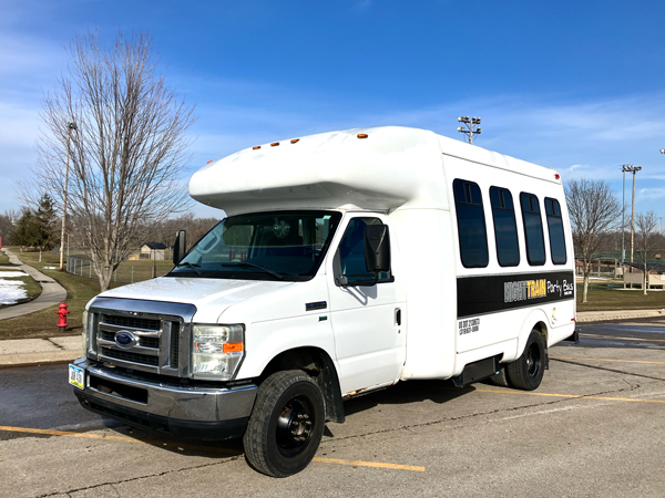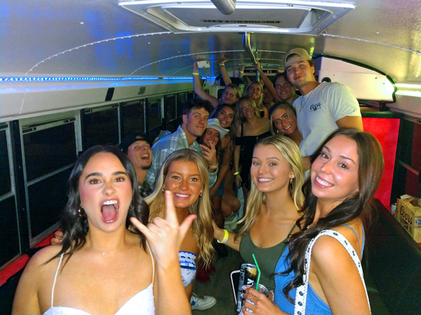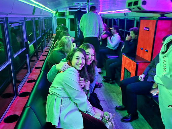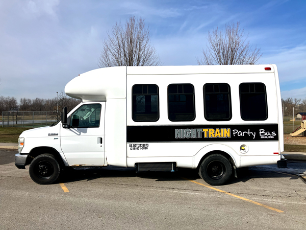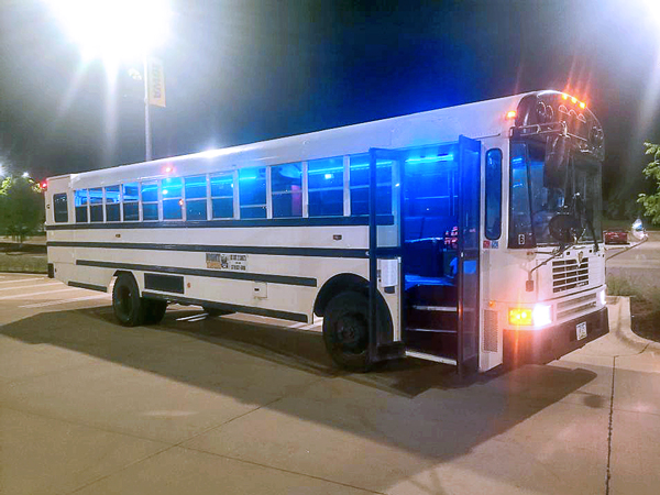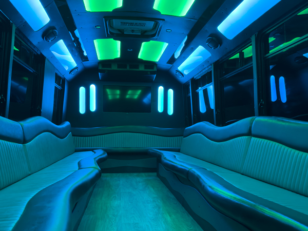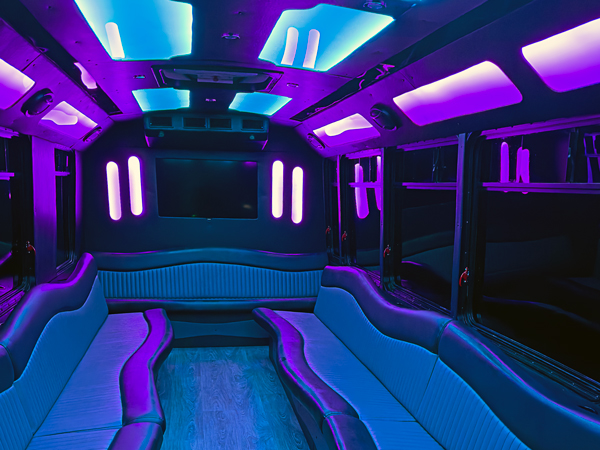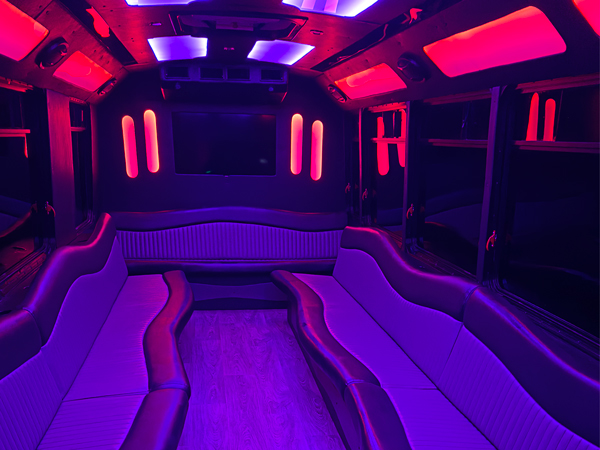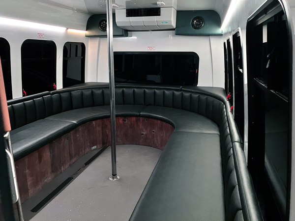 Heat, 6 surround speakers, 2-12″ subwoofers, rope lighting, bench seating along walls, limo tinted windows, equipped with 2 dancing poles, seating for 28, Bluetooth capable stereo system.