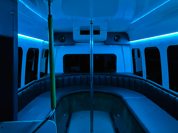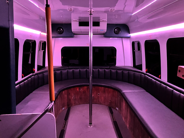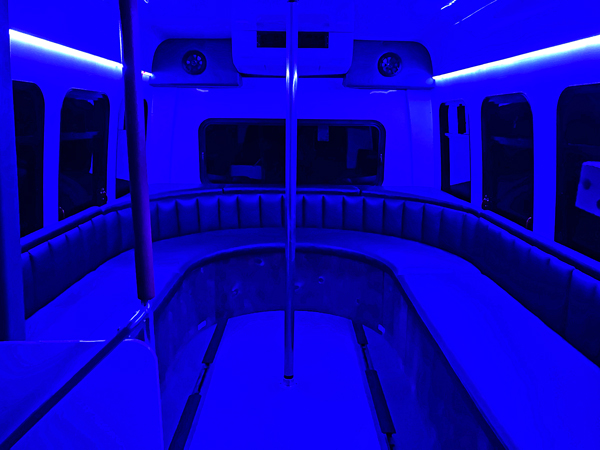 Ice cold A/C, heat, 4 surround speakers, 2-12″ subwoofers, bench seating along walls, LED multi color lighting, tinted windows, equipped with 1 dancing pole, seating for 14, Bluetooth capable stereo system.