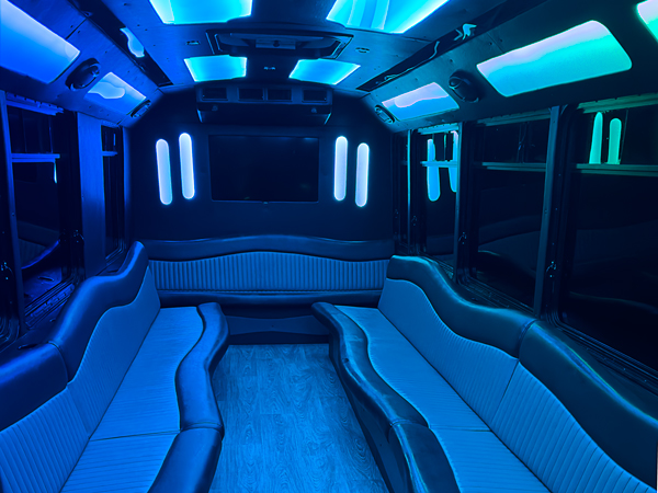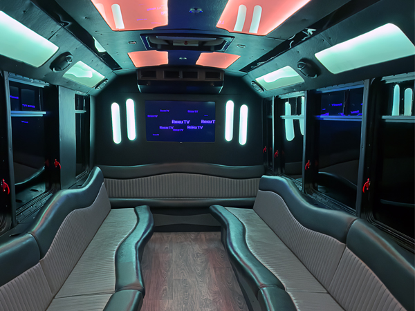 Ice cold A/C, heat, 6 surround speakers, 2-12″ subwoofers, Roku TV on rear wall, limo style interior, bench seating along walls, LED multi color lighting, tinted windows, seating for 25, Bluetooth capable stereo system.